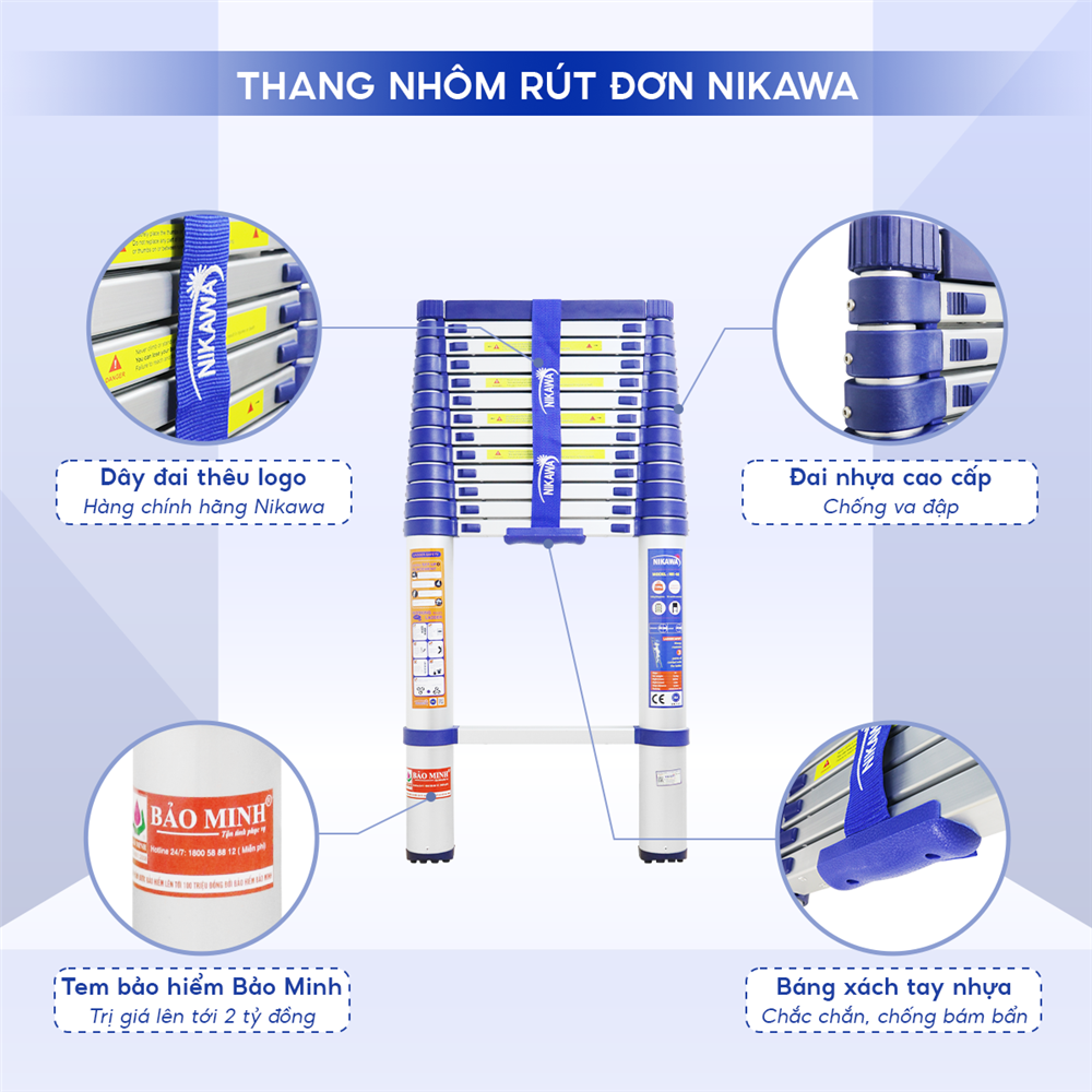 Nikawa NK-48 New được trang bị cơ chế rút từng bậc an toàn, khóa chốt tự động thông minh, giúp điều chỉnh chiều cao linh hoạt mà không gây sập bất ngờ. Khi thu gọn, thang sẽ tự động rút từ từ từng đoạn, giảm nguy cơ kẹt tay và tăng tuổi thọ thiết bị.
